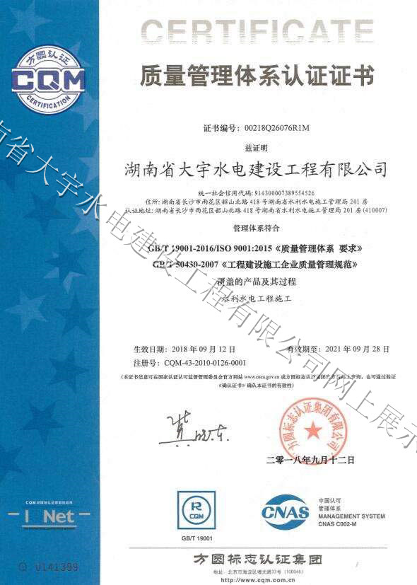 质量管理体系认证证书
