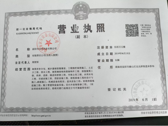 经营范围:建筑劳务分包、城乡基础设施建设、工程围栏装卸施工、土石方工程、排水工程、水利水电工程、交通设施工程,机械设备租赁。